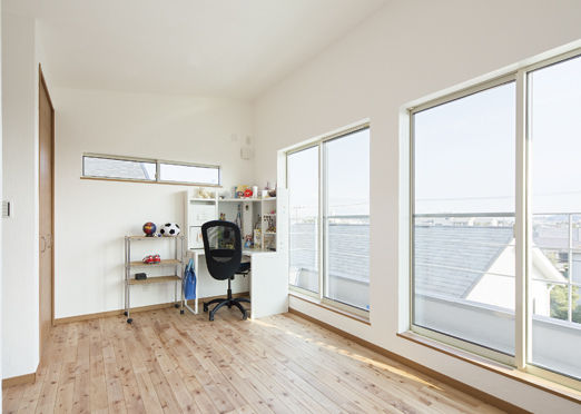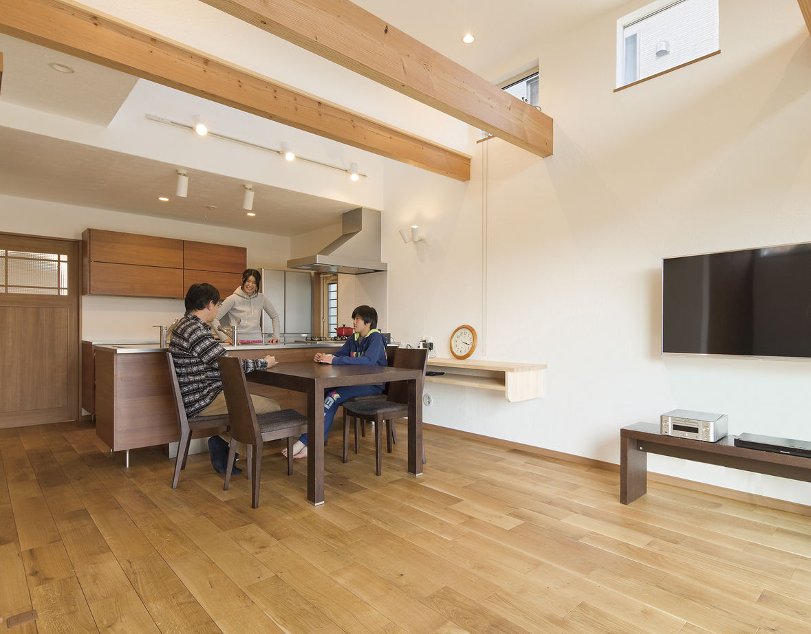 A. リビングは通風と採光を考え、高い位置にも窓を配置するなど、開放的な空間に仕上がりましたね。 中2階から子ども部屋がある2階へとつながる階段は、リビングの空間とつながっており、どこにいても家族を感じられる設計に。