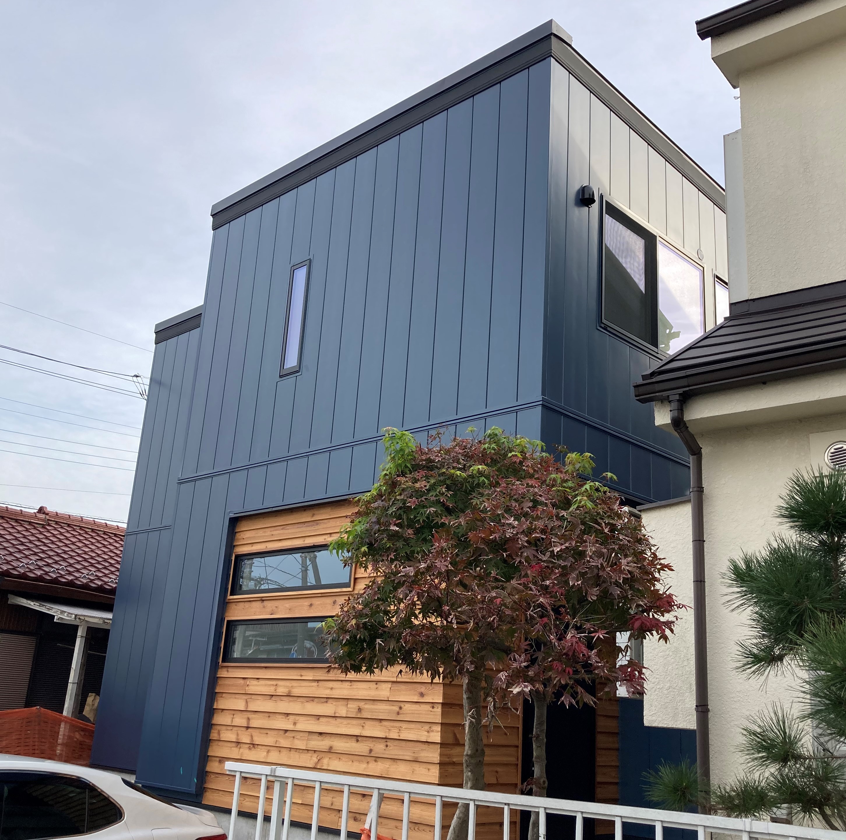 外壁はガルバリウム鋼板と玄関周りは木を鎧貼りで仕上げております。