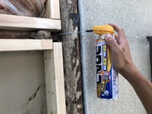 既に白蟻は居なかったのですが、新しい下地には消毒しておきます。