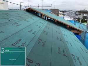 そして大事な防水処理!写真3枚目をご覧ください。アスファルトルーフィングと言い屋根の下葺き材です。ここでしっかり雨の侵入を防ぎます。