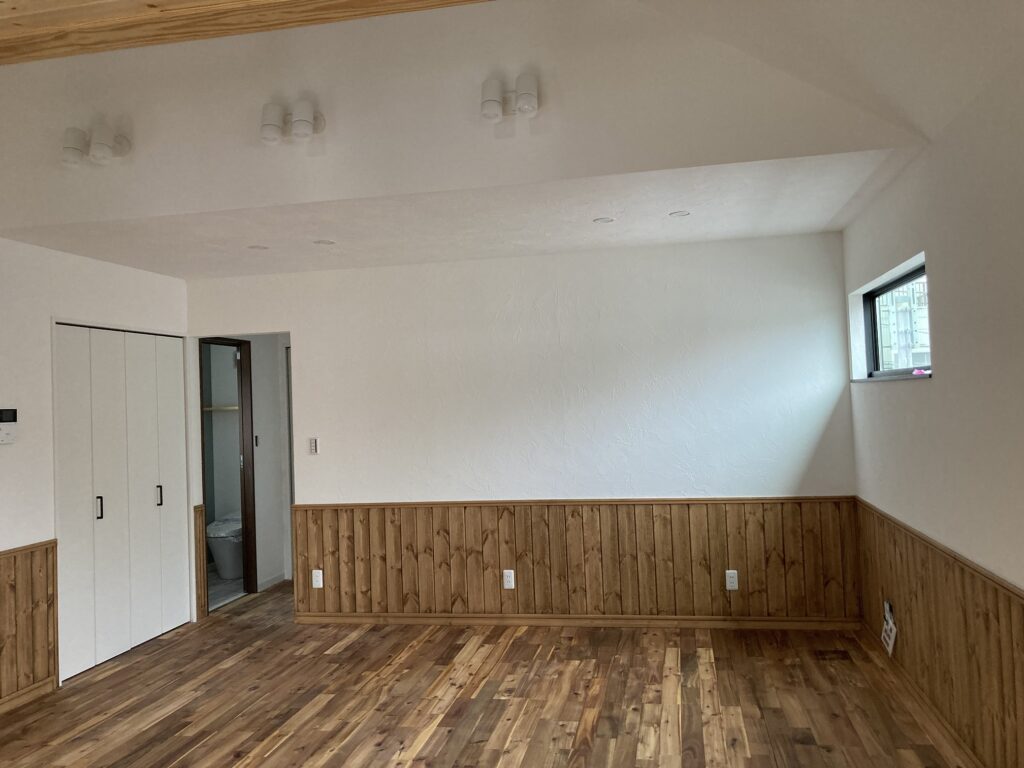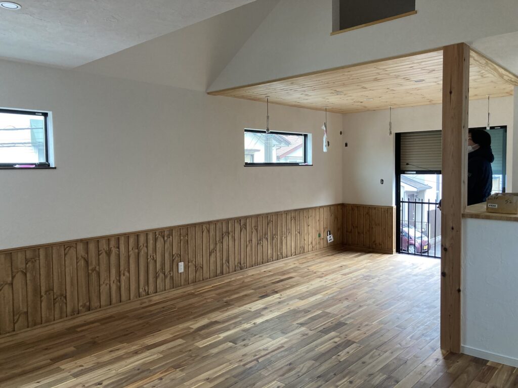 リビングの壁に腰の高さまで集成材を張り、色をフロアと合わせることにより、