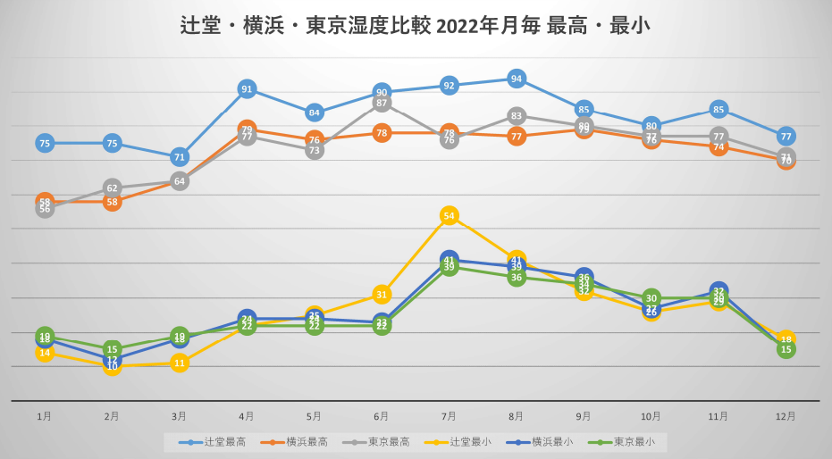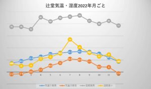 まずは、昨年2022年の辻堂の気温と湿度です。