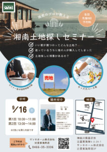 BLOG ブログ 2023.09.11 トピック 未分類 土地探しセミナー サンキホームでは、辻堂東海岸店オープンに伴い、 「湘南土地探しセミナー」を、辻堂東海岸店にて開催します。 不動産の仲介の経験豊富なスタッフが、 注文住宅の建築のプロの視点から、 土地探しのコツを伝授します。 お気軽にご参加ください! 湘南地域で新しい住まいや自然素材(漆喰や無垢材等)の家づくりをお考えの方は、 是非サンキホームまでお問い合わせ下さい 前へ ブログ一覧へ 次へ