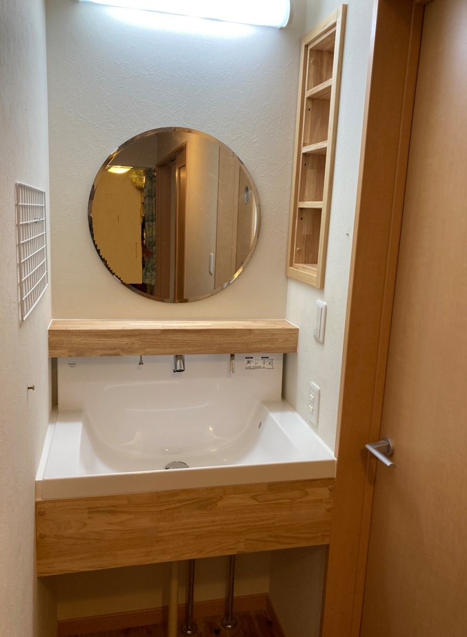 BLOG ブログ 2023.09.22 トピック プチリフォームで気分一新・・・・ デザインが気に入り取り付けた、 洗面ボールのサイズが小さく、小さいお子さんが使うたびに 回りに水滴が飛び散る状態に・・・ そこで、洗面コーナーのプチリフォームをする事に。 サイドには、壁厚を利用した棚も設置し、 雑然と置かれていた小物類も整理できそうです。 今回は、広めの洗面ボールをカウンタ―と組み合わせて、 取り付けました。 既製品の洗面台を置く以外にも、選択肢が有り 小さいスペースながら、ユニークなコーナーに 生まれ変わります。 朝の洗面タイムも、これからは気分一新できるのでは・・・ 前へ ブログ一覧へ 次へ