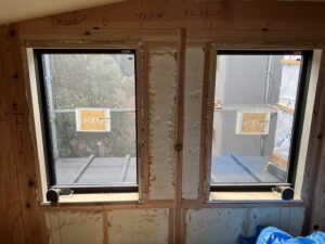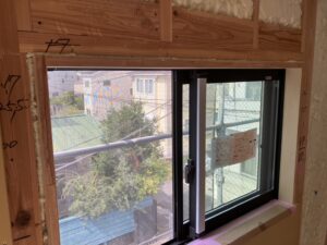 窓枠は吹付施工後の取付となるため、吹付ができていない場合があるのでしっかり