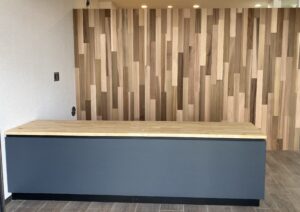 入口カウンターとレッドシダーのカウンターバックパネルでお出迎え!