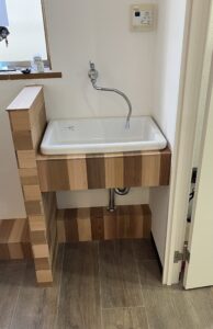 洗面台もレッドシダーでカウンターを作成して、事務所内の一体感が出るようにしております。