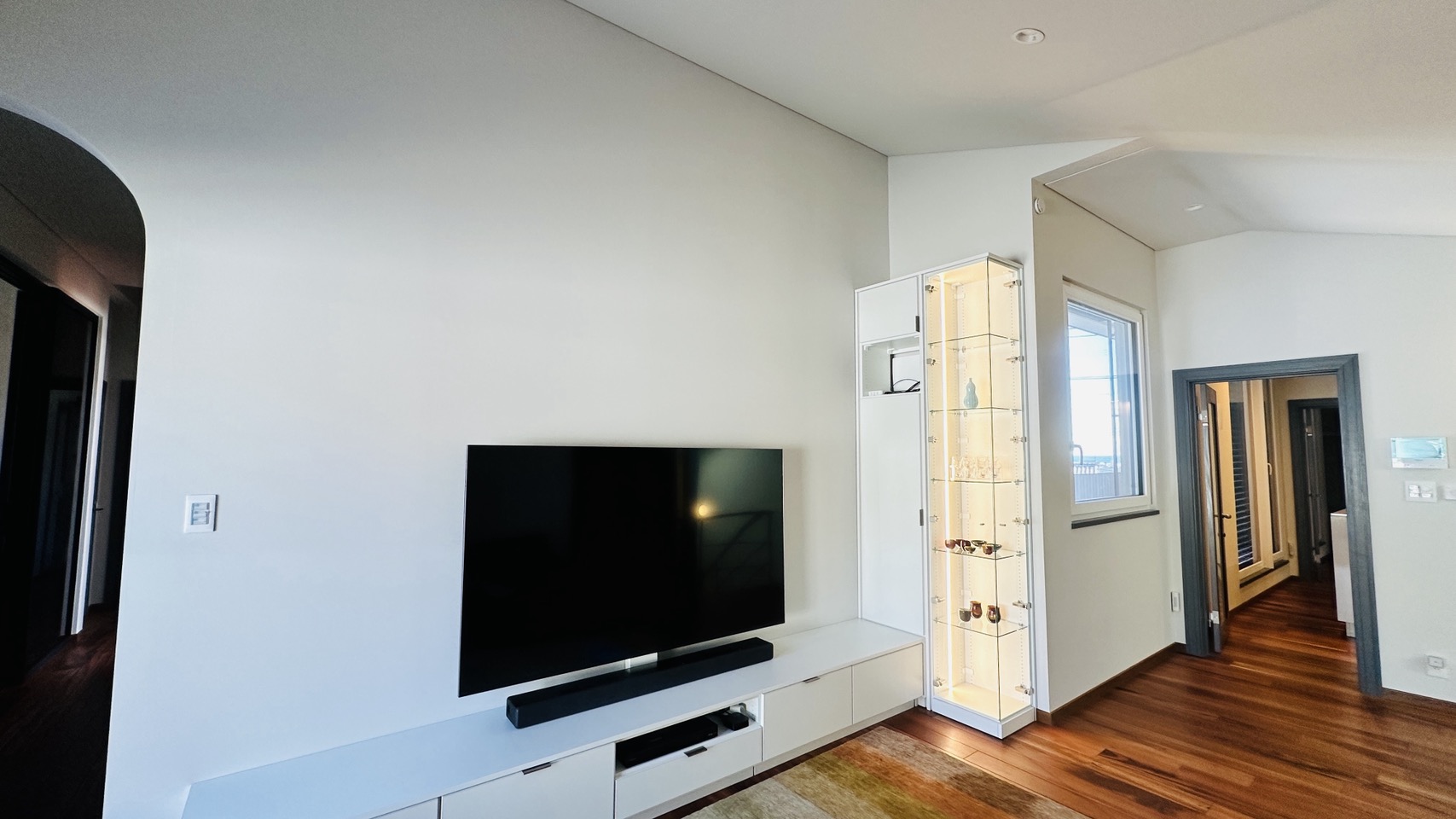 白い壁に白い家具、テレビ台の横に煩わしさを感じないトールキャビネット。