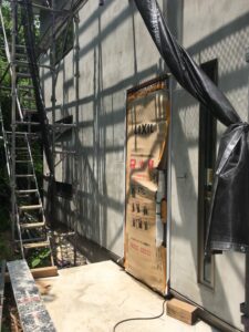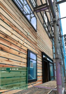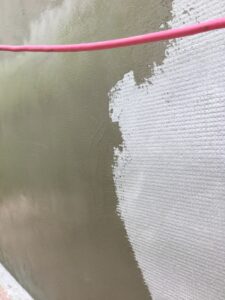右側の白い網のようなものは、メッシュシートです。このメッシュシートを全面に張り、仕上げのモルタルをしごいていくことによりクラックが入りにくくなるのです。