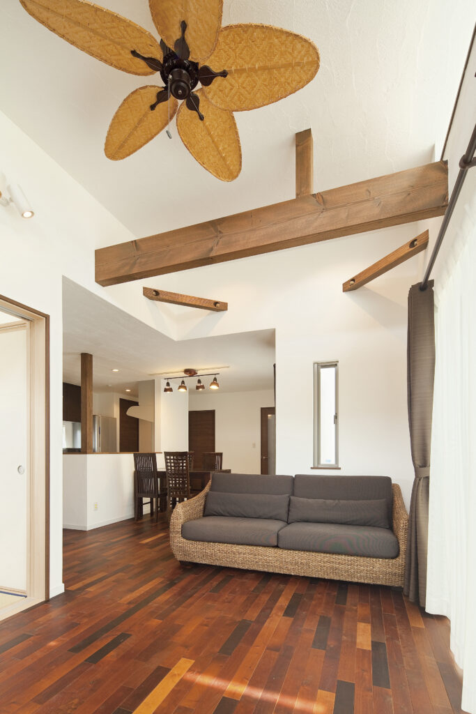 高く作られた天井で解放感を演出し、無垢床や壁の石タイル・漆喰でリゾートテイストの空間をつくっています。