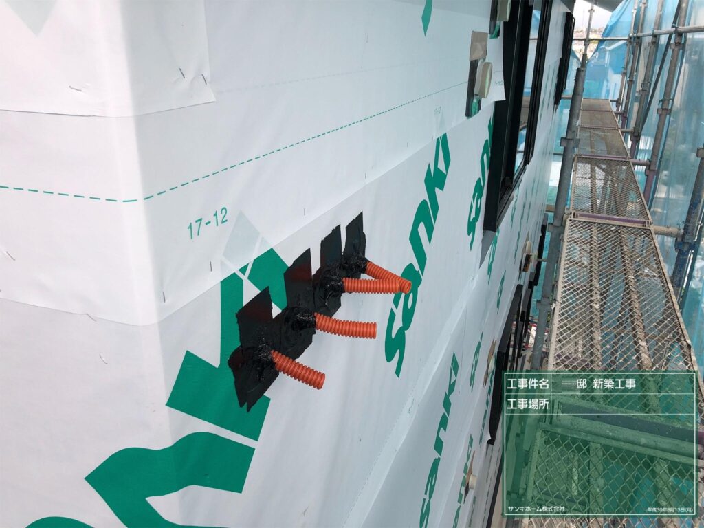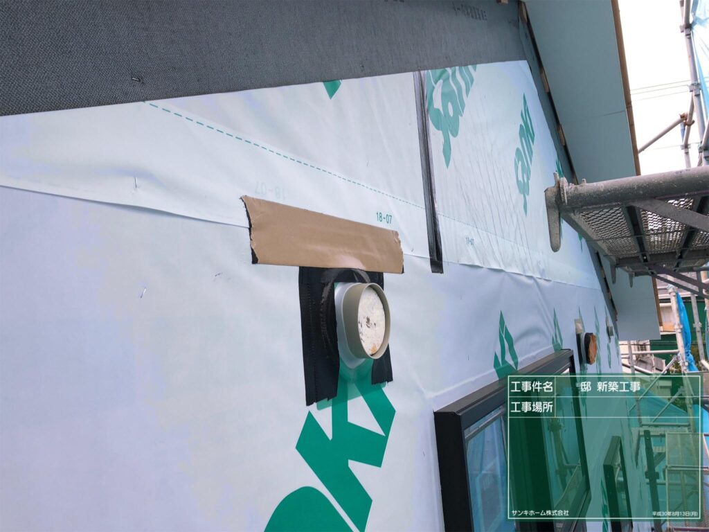 趣味室のある家は外部の透湿防水シートを張り、継手やら貫通部分にもきちんと防水し、瑕疵保険の防水検査を今かと待ち受けております。