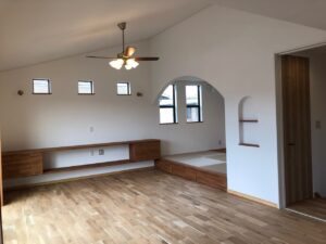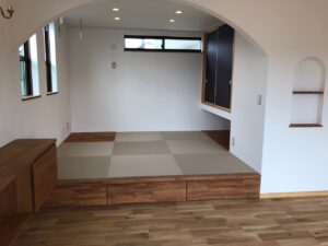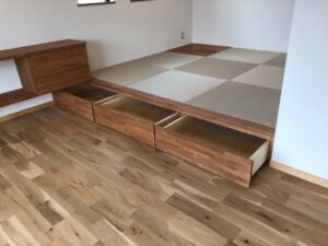 Rの下がり壁で仕切られた小上り畳コーナーの下には引出しを作り収納力抜群