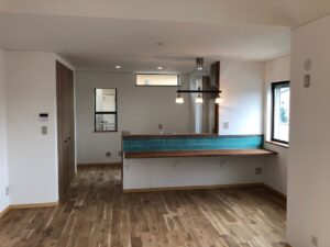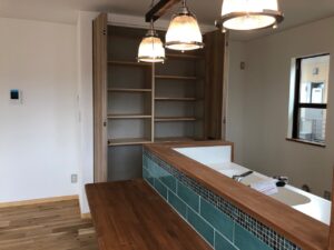 キッチンにはたっぷり収納のパントリーやブルーのタイルを採用して単調に