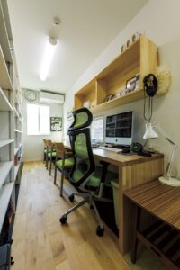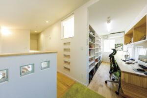 書斎といえばどこか堅いイメージがしますが床の天然木が優しさを表現しています。