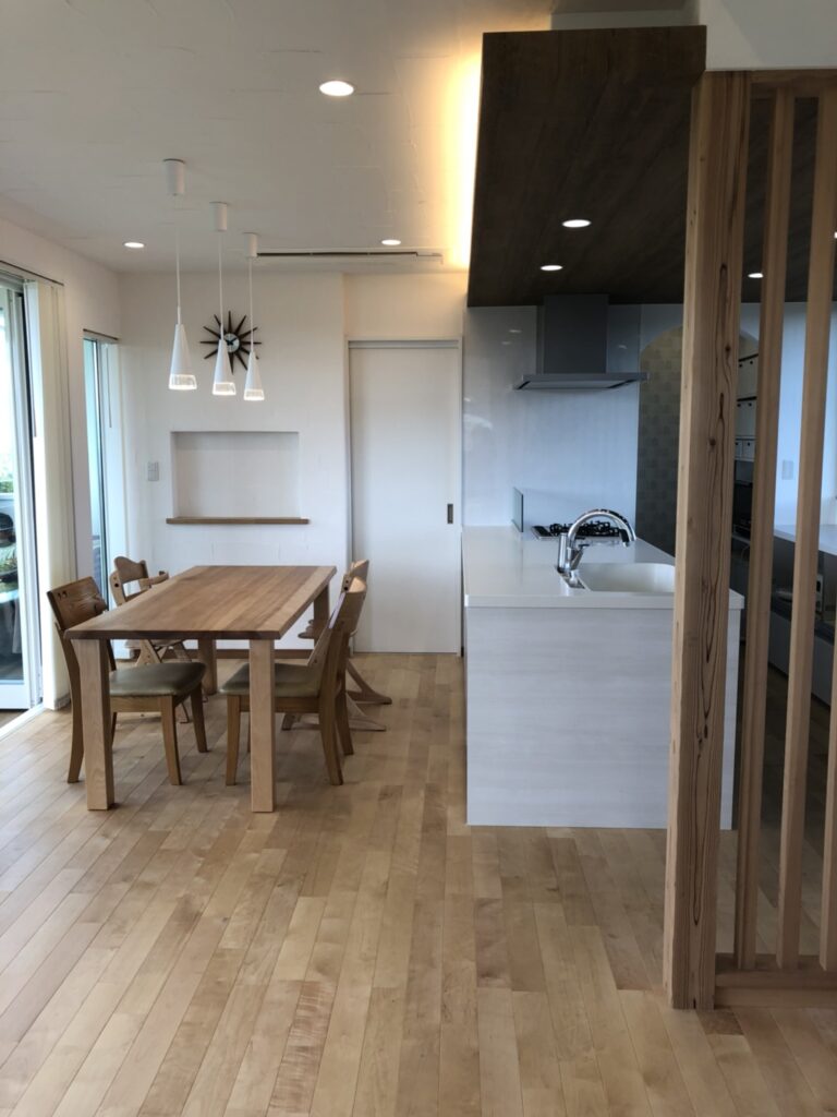 ペニンシュラ型のキッチンに、ペンダントライトが連なるダイニングと
