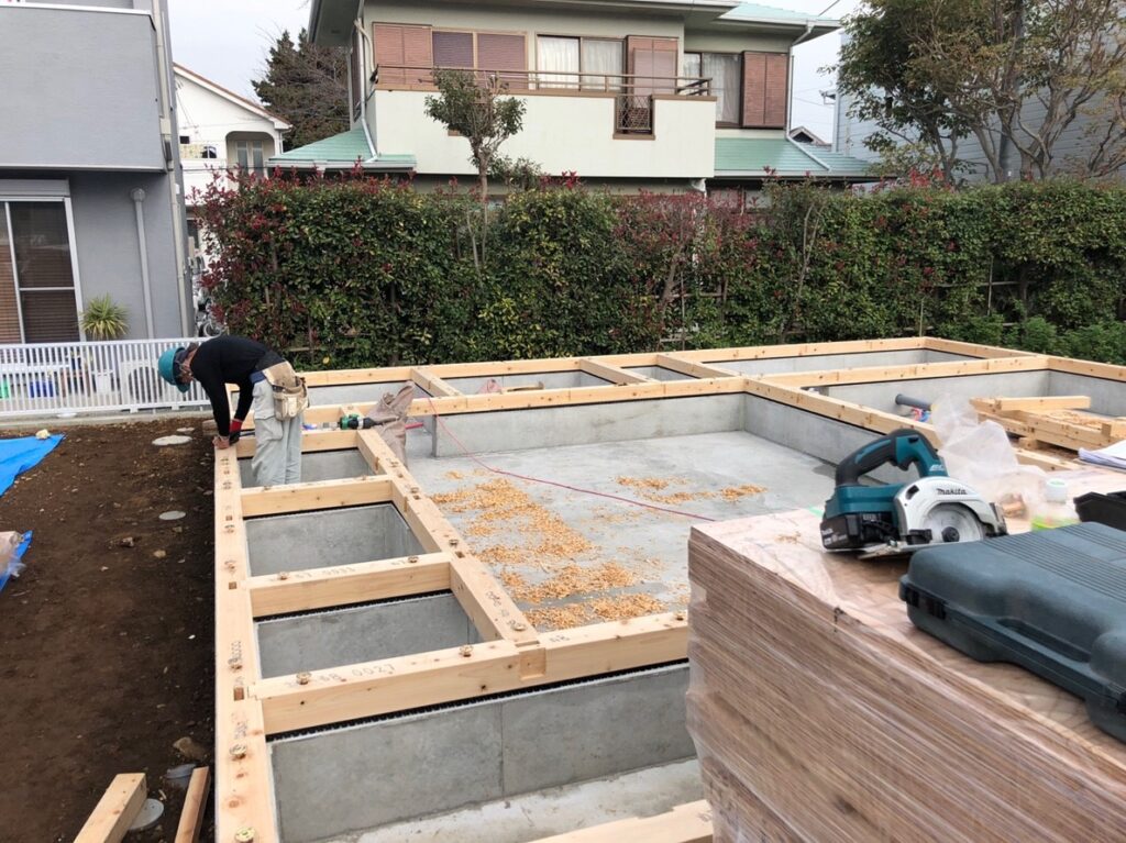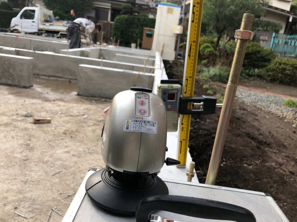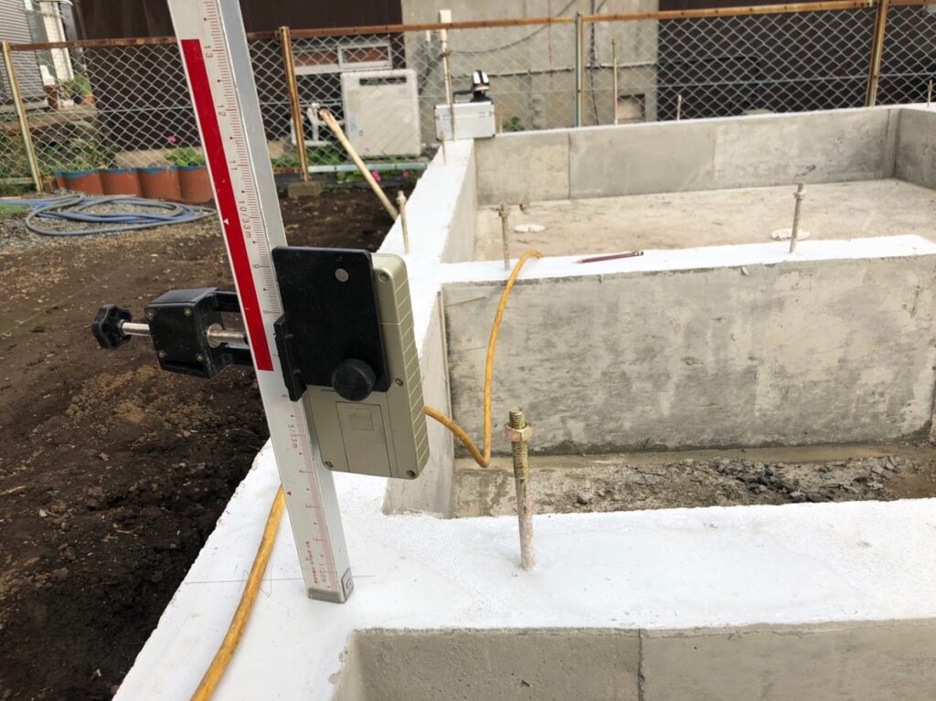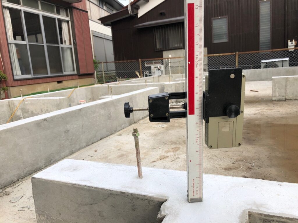 脱枠工事中ですが基礎屋さんをお邪魔して天端レベル確認、