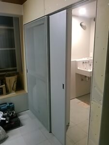 BLOG ブログ 2017.09.09 未分類 目隠し引戸 施工途中の写真ですが、設計事務所の先生が 考案された目隠しを兼ねた引戸です。 手前が洗面入り口、奥側が床置きエアコンと 造作棚が仕込まれており、エキスパンドメタルを 用いた引戸で、視線を遮り、かつ冷温風の吹出しに 支障ない造りになっています。 シンプルでありながら機能性を損なわない間仕切とです。 前へ ブログ一覧へ 次へ