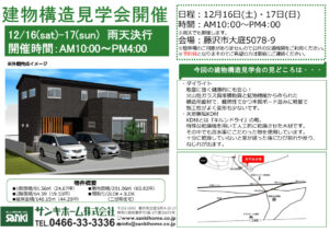 BLOG ブログ 2017.12.16 未分類 構造見学会実施中です こんにちは。 只今、当社の物件で構造見学会を行っております。 ・これから新築を考えている方 ・家を建てたいがどこに相談したらいいか分からない方 など、サンキホームのお家の構造をじっくり見て頂けると思いますので この機会に是非、ご来場くださいませ。 尚、予約制となっておりますので ご来場の際、お手数ではございますがご連絡を下さいませ。 前へ ブログ一覧へ 次へ