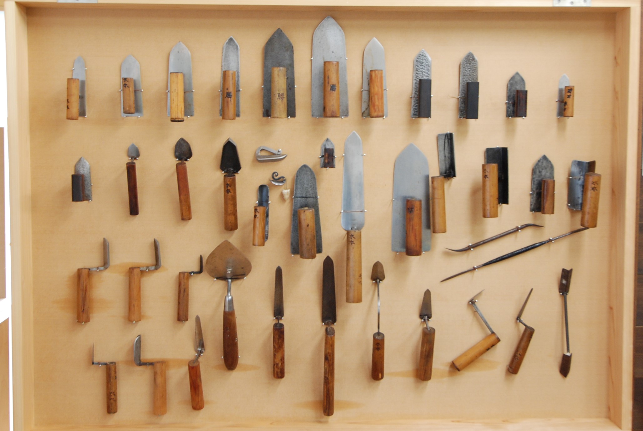 先日、辻堂元町にある本社の会議室に左官で使う鏝(こて)を飾りました。