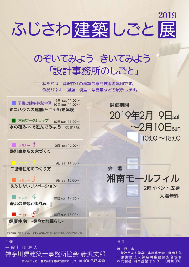 「ふじさわ建築しごと展2019」は湘南フィルモールで開催致しますので、