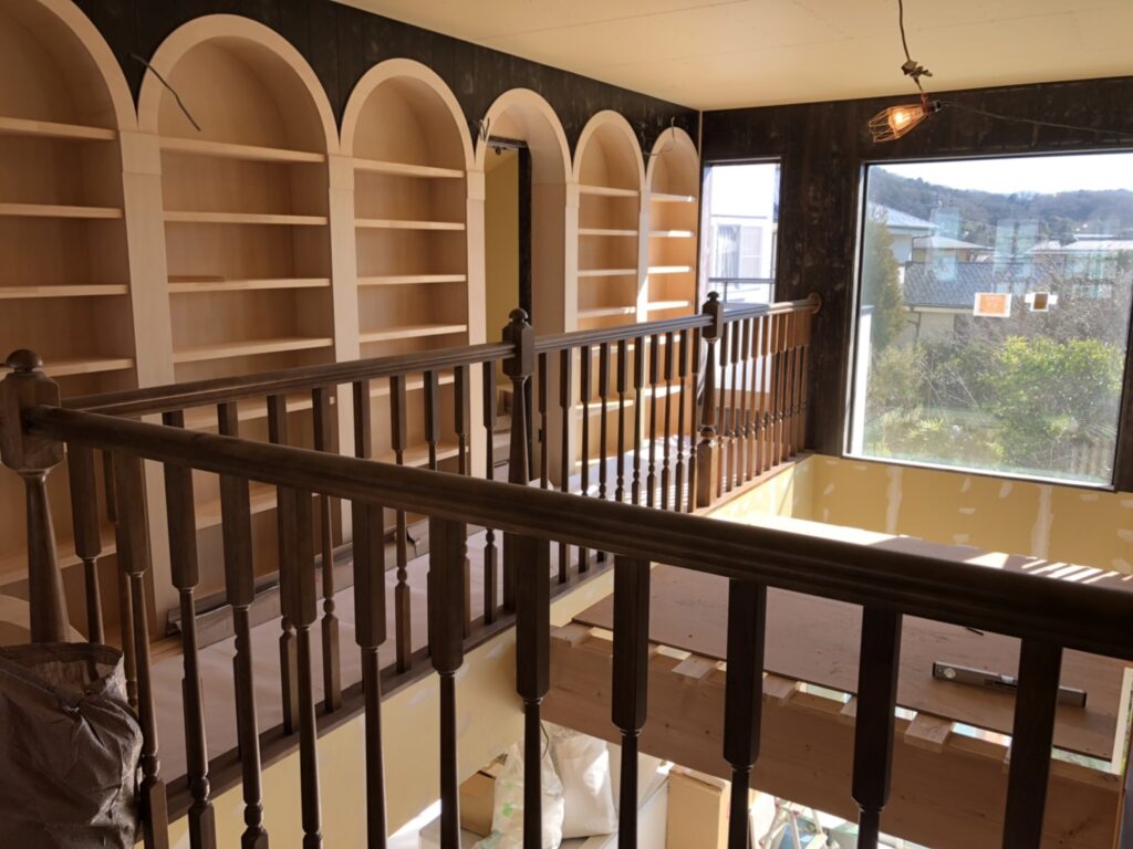 2階の中央の吹抜部分は3方を木製オープン手摺の廊下で囲まれており、更にその廊下の全ての壁には造作の本棚が設けられております。その他にも造作で施工した箇所が多く造作感も満載です。