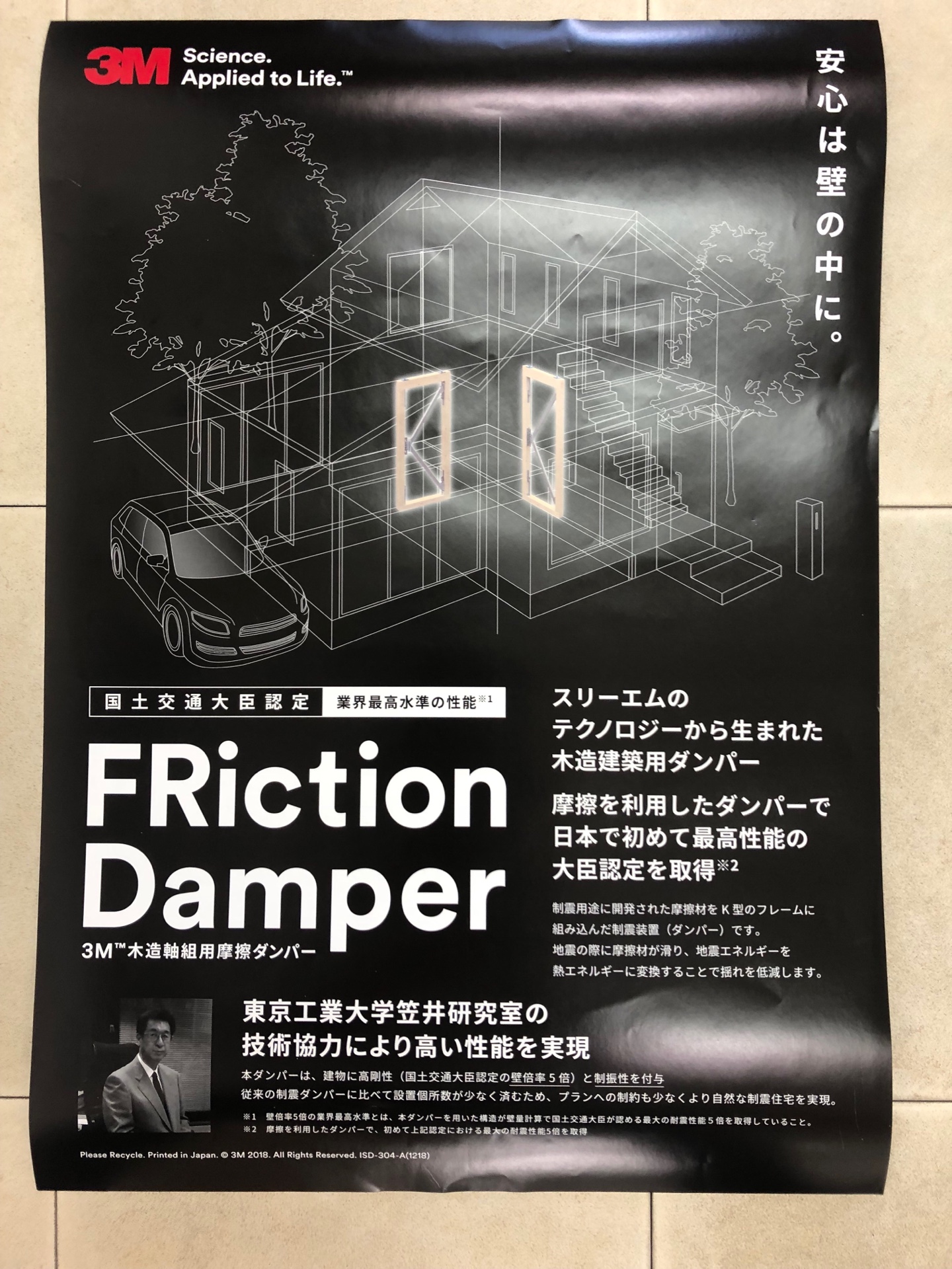 今回ご覧頂ける建物には『制震ダンパー』が設置されております。 摩擦を利用した木造建築用のダンパーで日本で初めて最高性能の大臣認定を取得したものになります。制震用途に開発された摩擦材をK型のフレームに組み込んだ制震装置です。地震の際に摩擦部が滑り、地震エネルギーを熱エネルギーに変換することで揺れを低減します。
