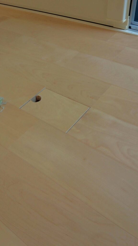 ホットプレートなどをされる時に、離れたところからコードを引っ張ってくると、お子様がコードに引っかかって転んでしまう、ホットプレートを引っ張り落してしまう危険性があるとの事で、ダイニングテーブルの下にフロアコンセントを取り付けるご提案をさせて頂きました。