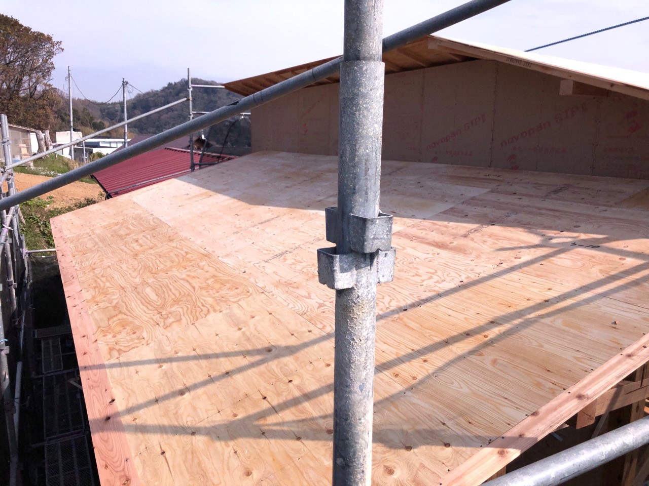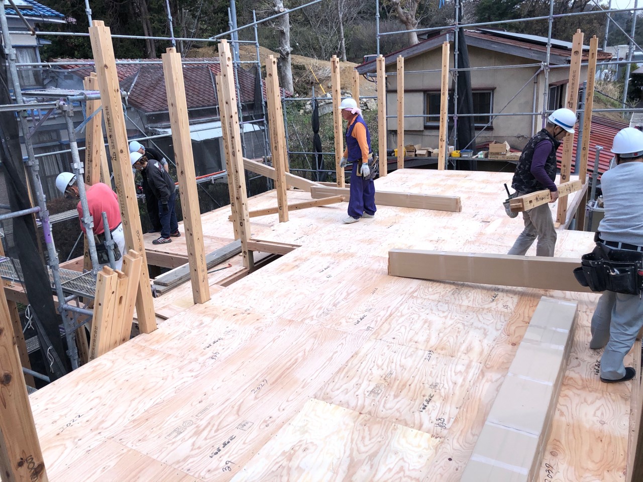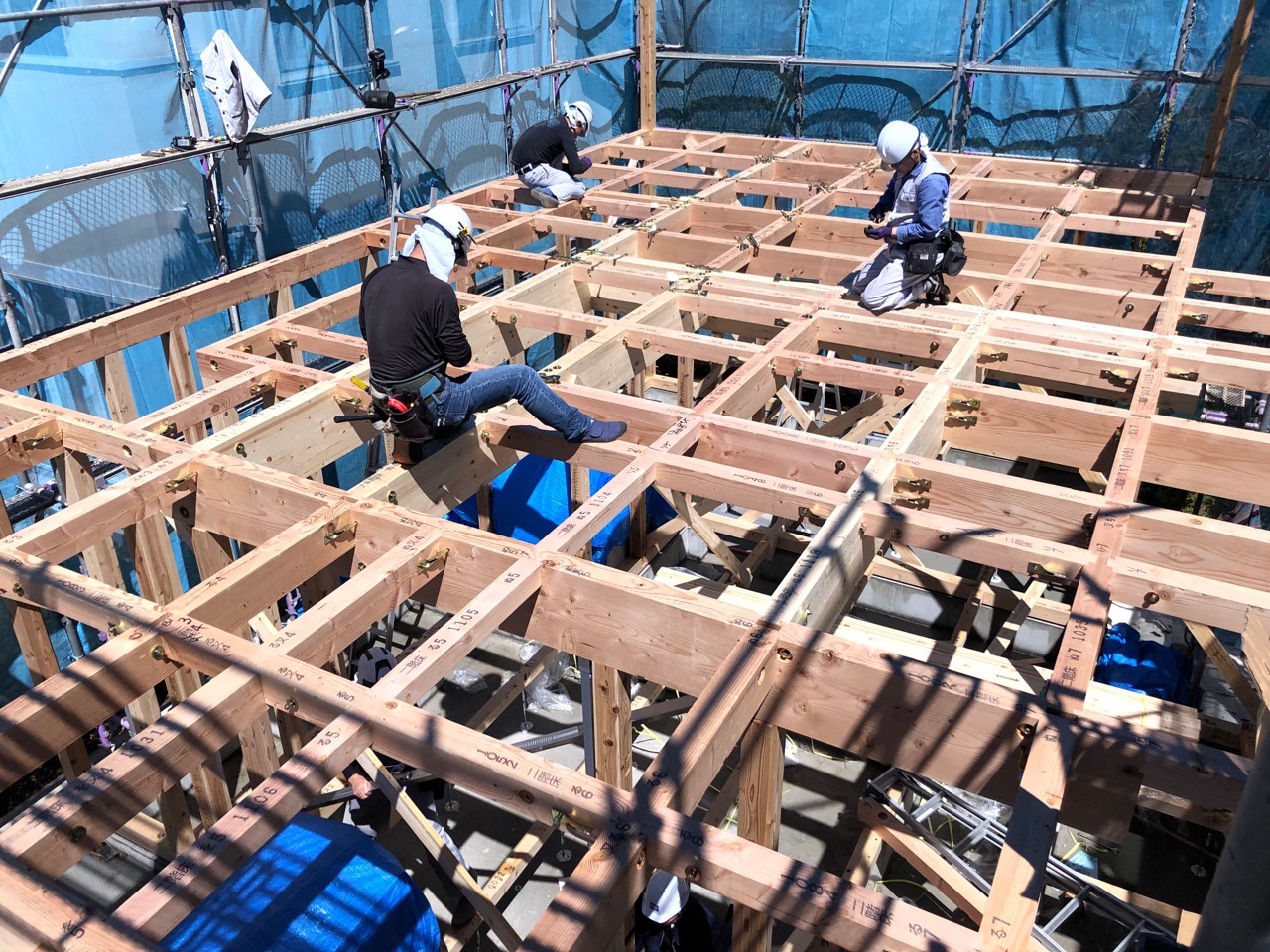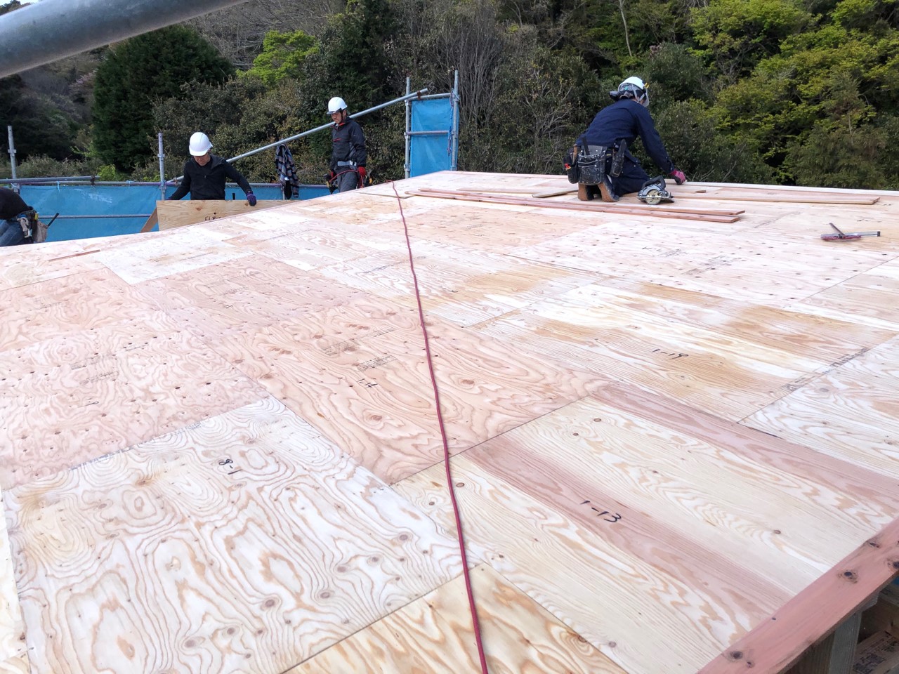 この時期は天候が不安定なので1階床下地合板を後施行にする選択をしています。