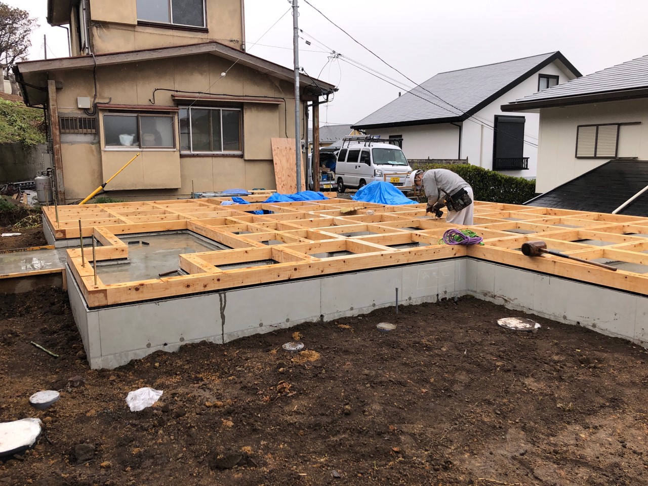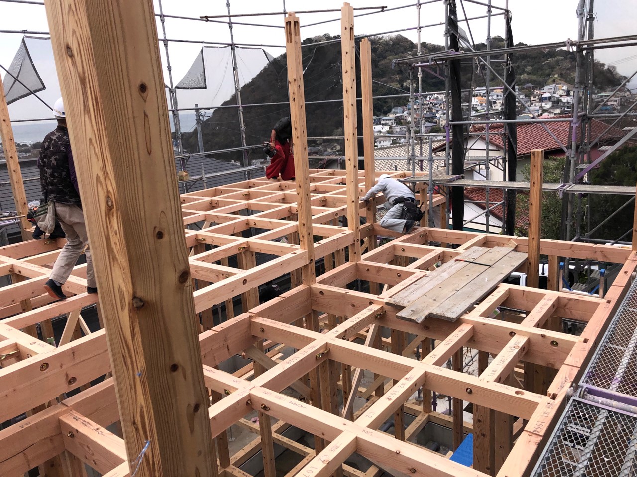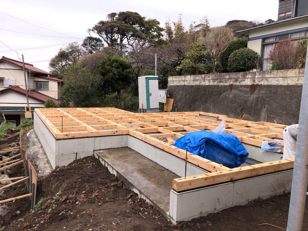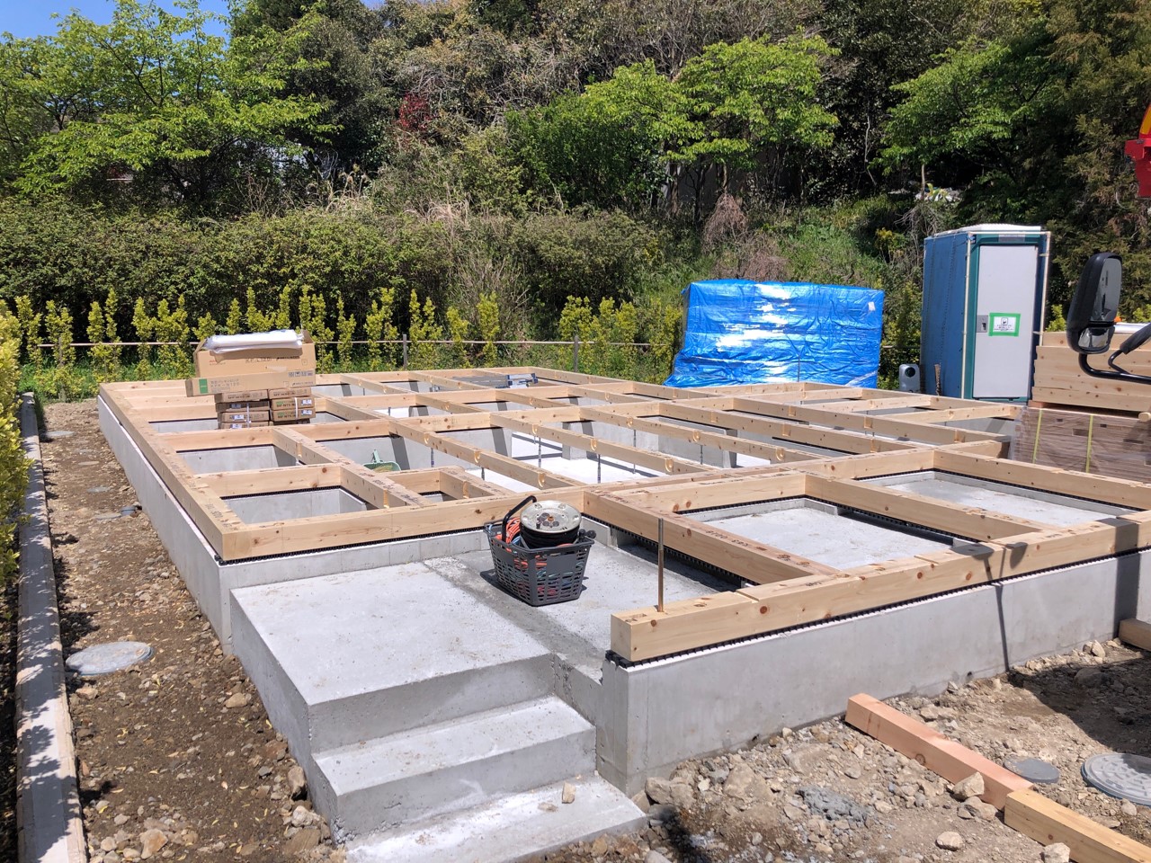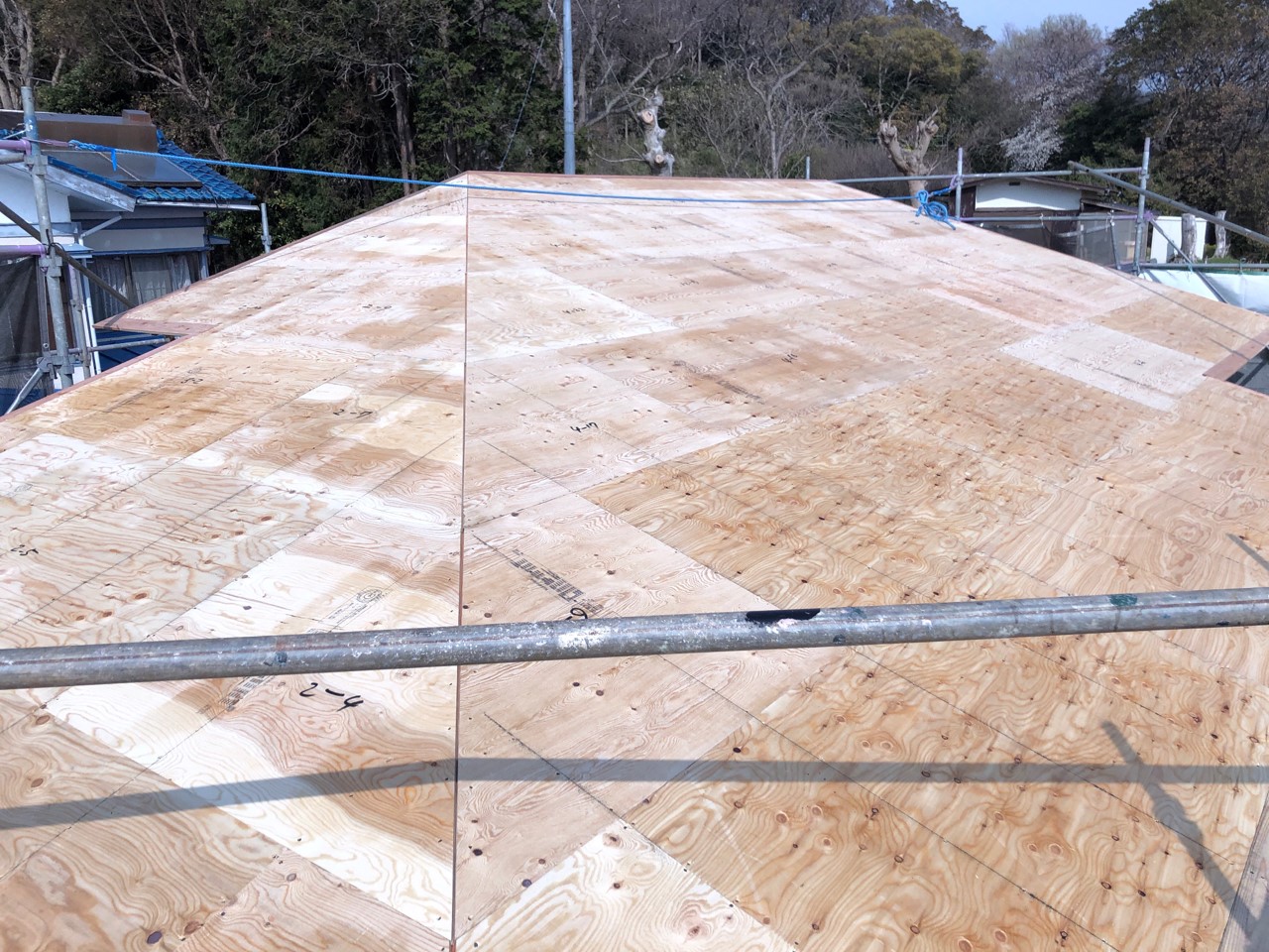 この時期は天候が不安定なので1階床下地合板を後施行にする選択をしています。