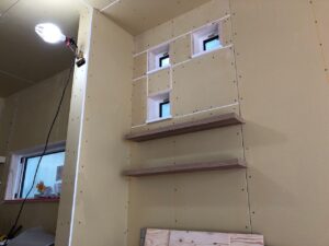 アクセントにタイルやお洒落な棚板を採用しているので仕上がりが楽しみです。
