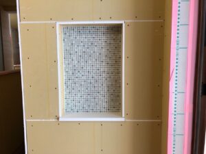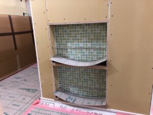 アクセントにタイルやお洒落な棚板を採用しているので仕上がりが楽しみです。