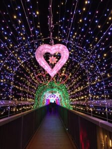 つり橋は❤マークのゲートが入り口(⌒∇⌒)。そこから光のつり橋スタート!とても幻想的でキレイ!♡(⋈◍>◡<◍)。✧♡