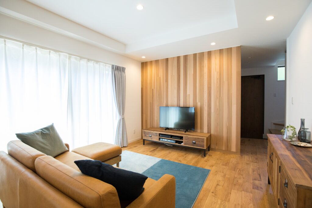 レッドシダーのアクセントウォールがおしゃれなLDK。