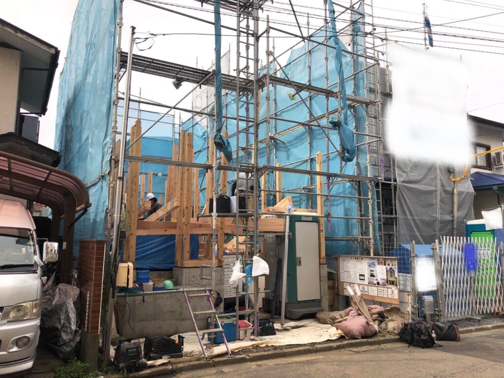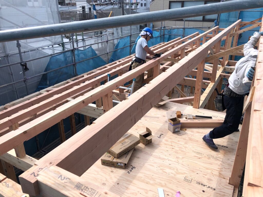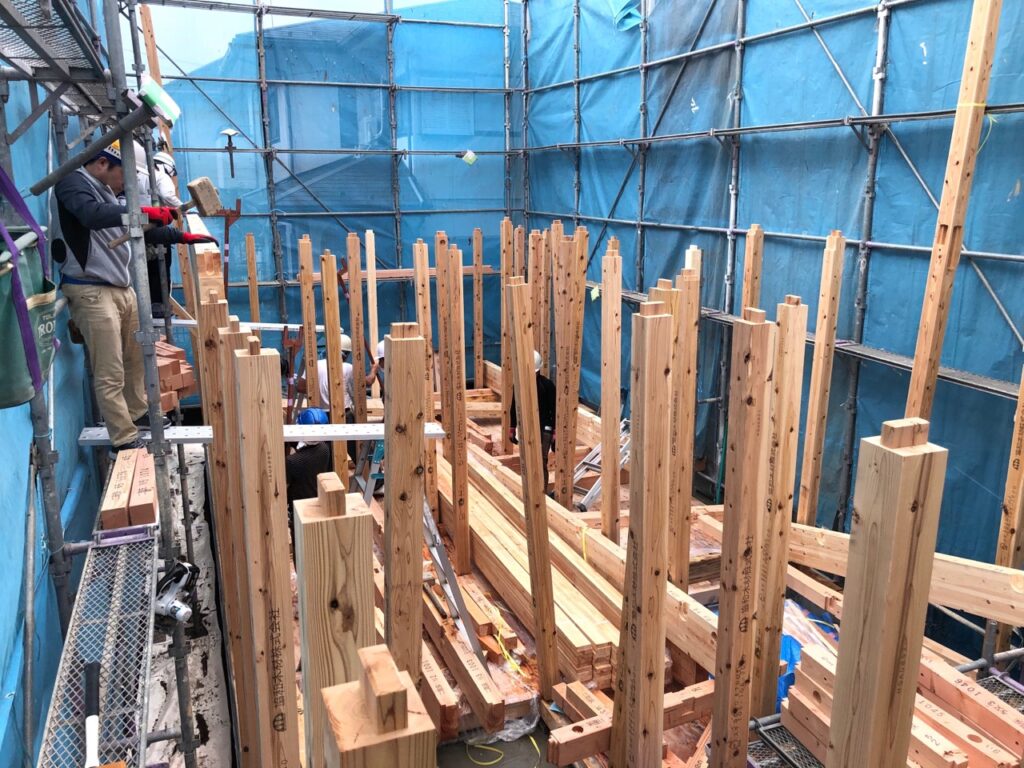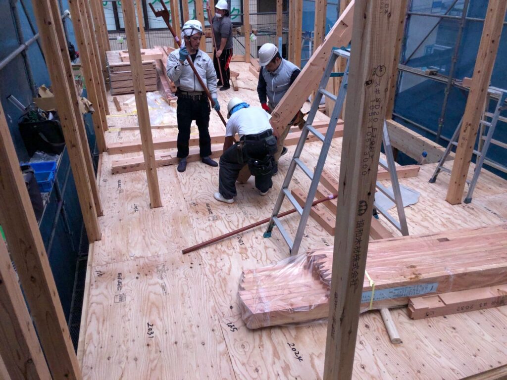 前面道路には電線が貼り巡らされているので重機を使わづに手起こしで上棟、