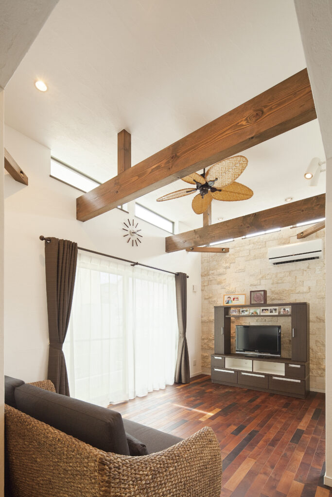 高めに作られた天井で解放感を、存在感のある石タイルと漆喰の壁でリゾート感と明るさをだしています。