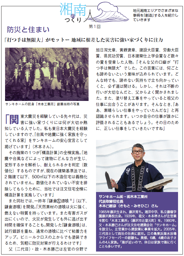 BLOG ブログ 2019.09.06 未分類 雑誌で紹介されました みなさん、こんにちは。 先日発売されたフリーペーパーLien湘南9月号にて 弊社関連会社の㈱木本工業所が掲載されました。 当社の前身の会社である㈱木本工業所をはじめ 鎌倉漆喰についても取り上げて頂きました。 調湿、防火等の効果がある鎌倉漆喰を是非 ご検討されている物件にいかがでしょうか。 湘南地域で新しい住まいをお考えの方 自然素材(漆喰や無垢材等)の家づくりをお考えの方は 是非サンキホームまで! お問い合わせお待ちしております。 前へ ブログ一覧へ 次へ