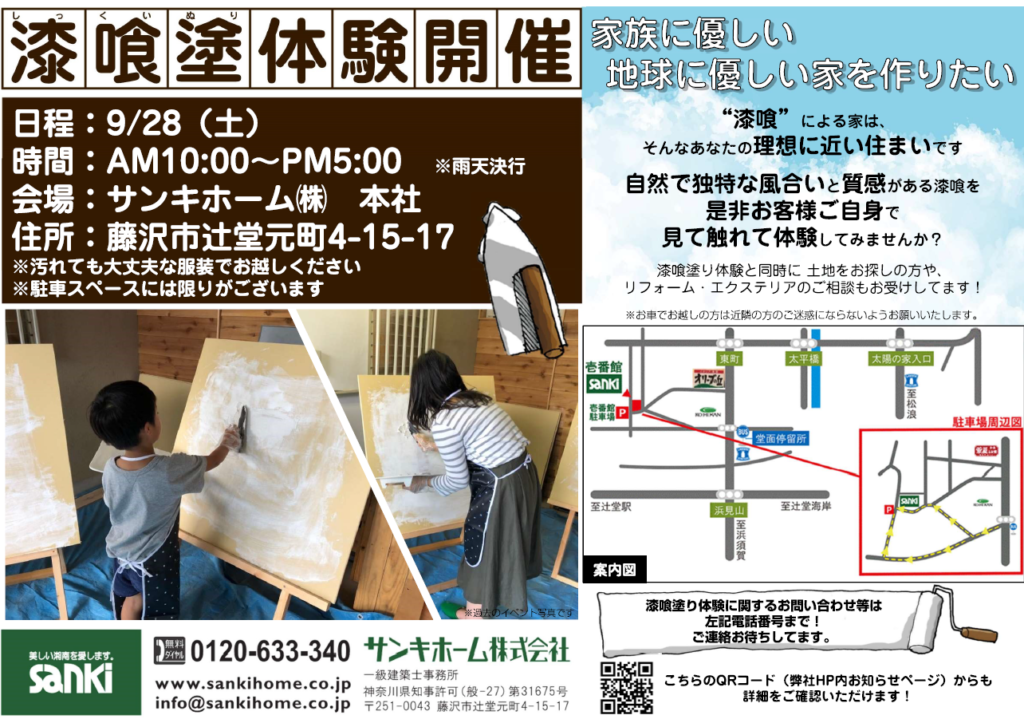 BLOG ブログ 2019.09.26 未分類 今週末漆喰塗り体験開催します! みなさん、こんにちは。 今週末28日(土)にお子様にも人気の 漆喰塗り体験の開催を予定しています! 【開催日程】9月28日(土) 【開催時間】AM10:00~PM5:00 ※雨天決行 【会 場】サンキホーム㈱ 本社 【住 所】藤沢市辻堂元町4-15-17 ※汚れても大丈夫な服装でお越しください。 ※駐車スペースに限りがございます。 まだまだご予約お待ちしておりますので、 興味のある方は是非こちらよりご連絡ください。 0120-633-340 皆様の参加をお待ちしております! 前へ ブログ一覧へ 次へ