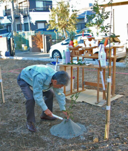 盛砂に鍬を入れる「穿初めの儀(うがちぞめのぎ)」をお施主様が、鋤で砂をならす「地曳きの儀(じびきのぎ)」を施工会社が担当します。