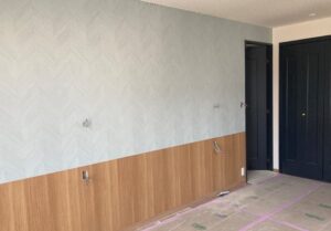 リフォーム後には木目と淡い青のクロス、建具はダークブルーに塗り替えました!