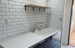 キッチンは奥様が悩みに悩んだタイルで仕上げ、シンクの上にはタオル等を置く棚を設置致しました。