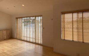 リビングは無垢のメープルフローリングに、天井と壁は漆喰仕上、カーテンは桐のカーテンで自然素材満載のお部屋になりました!