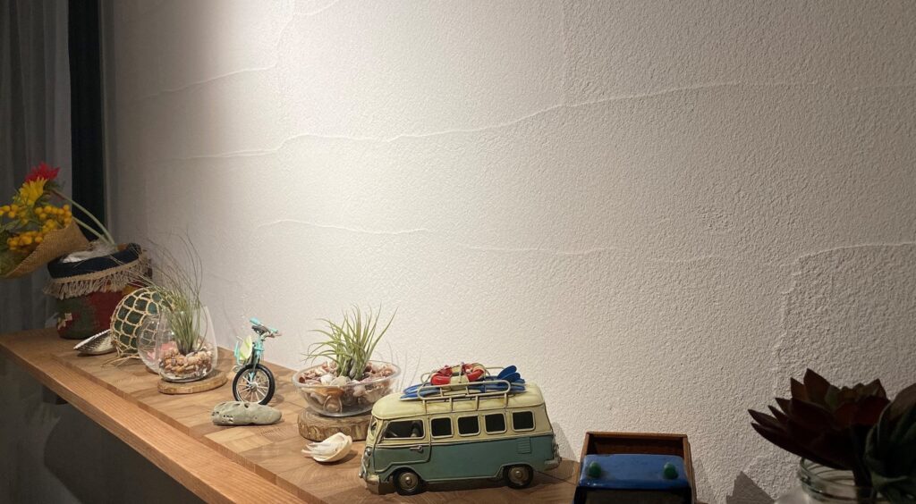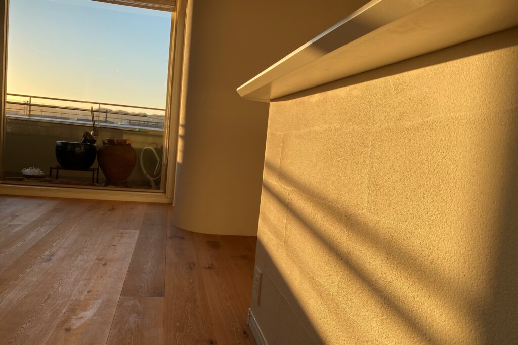 本物件のお施主様はサーフィンをなさるので、朝早く起きて海に行かれるのですが、最近は波が無くても朝部屋に入る太陽の光と漆喰の色味の移り変わりを見ているだけでも癒されるそうです。