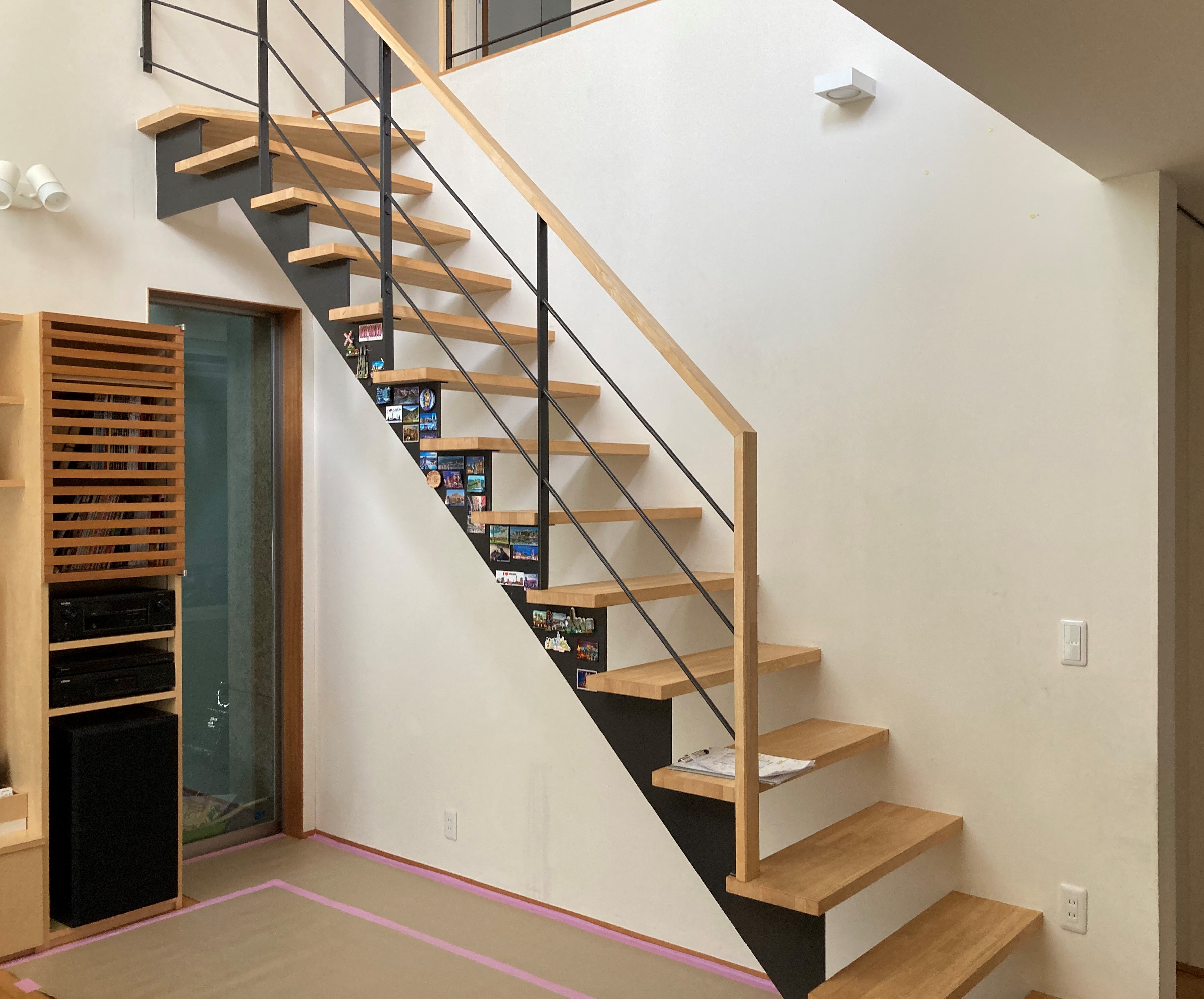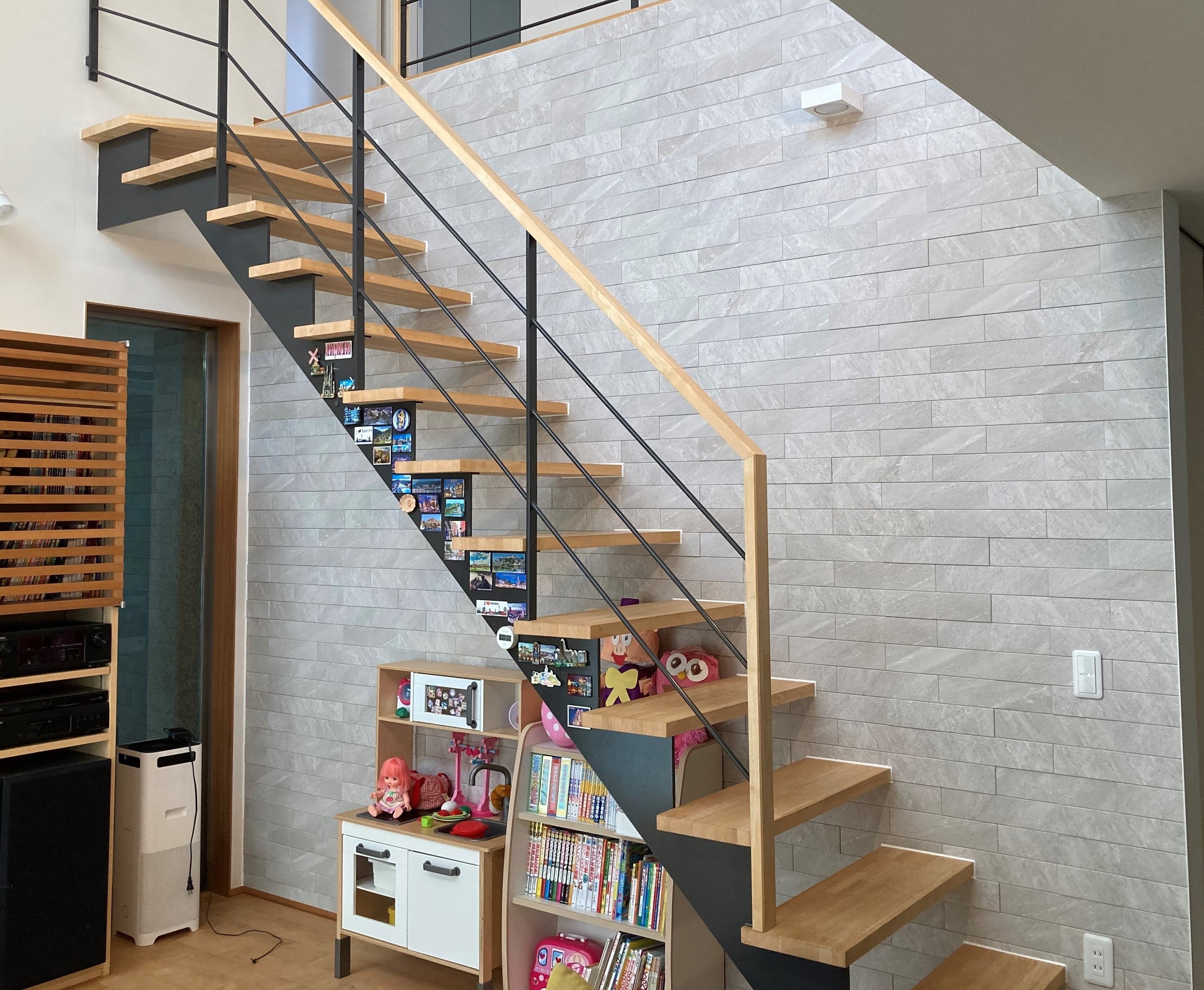 お子様が階段を上る際に壁を触りながら上がるそうなので、壁一面にエコカラットを施工しました。