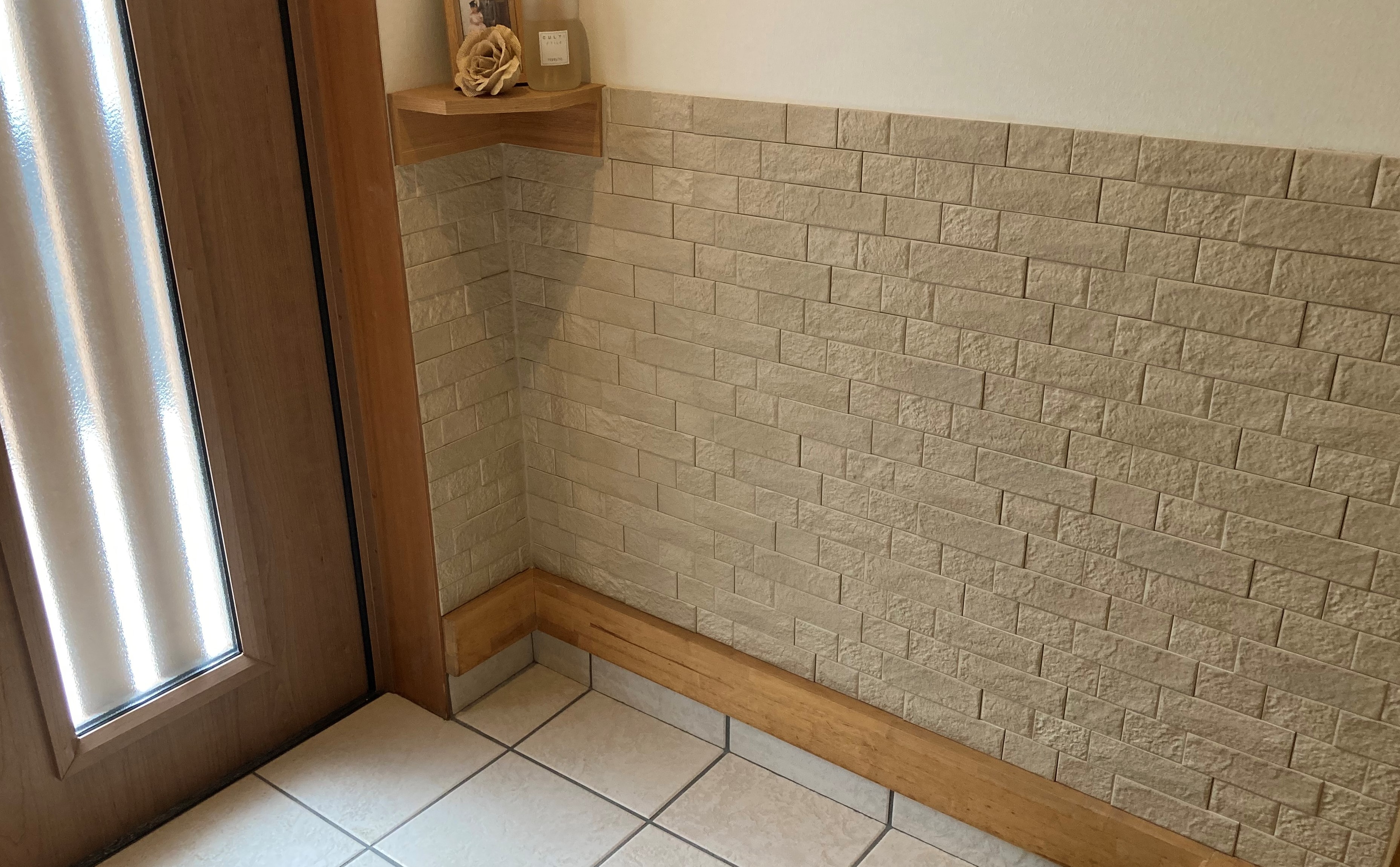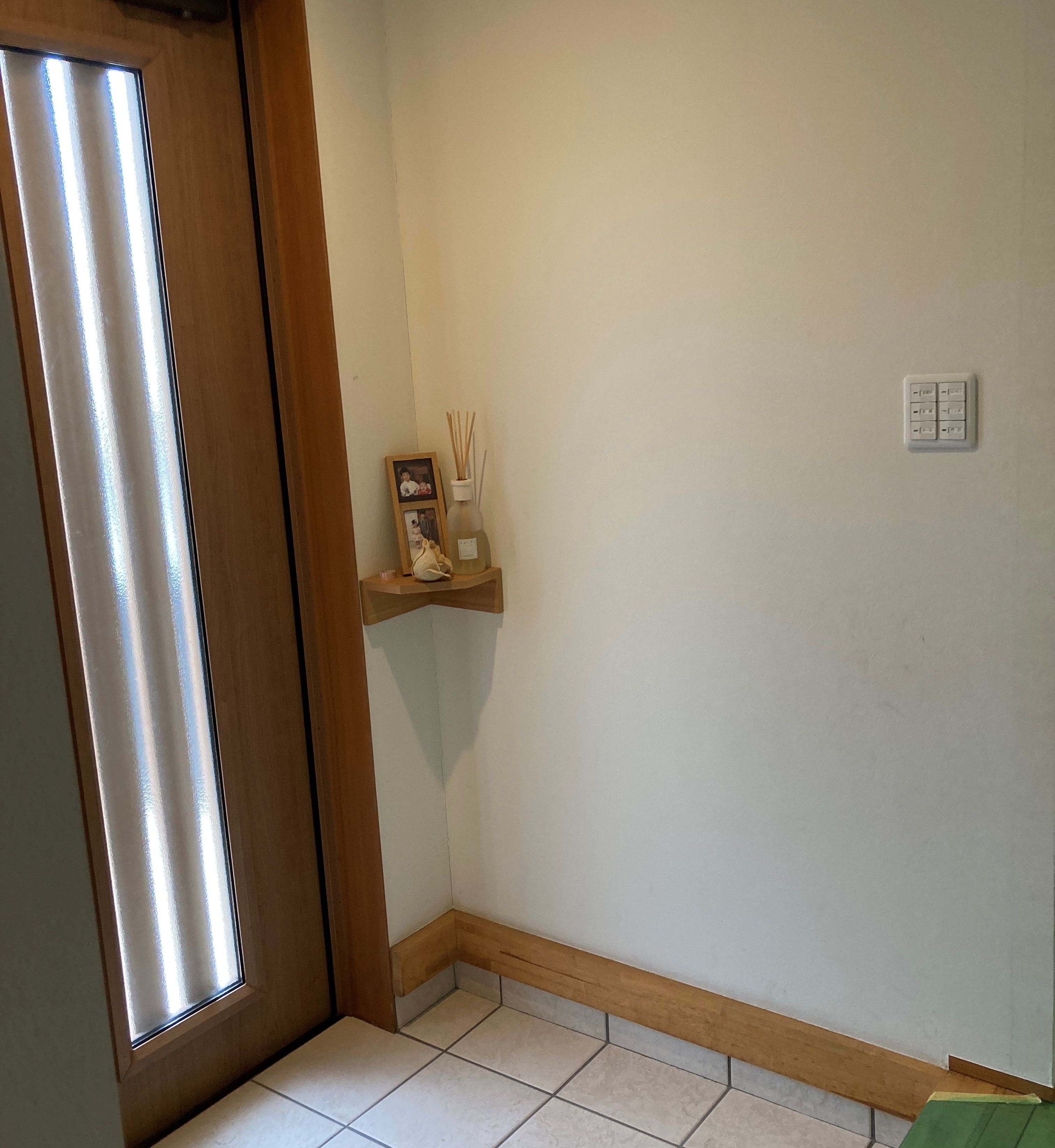 元気に外で遊んで帰ってくるので玄関もやはり汚れと臭い対策にエコカラットを施工しました。玄関はエコカラットをどこまで貼るか悩まれましたがカウンターの位置にあわせて施工しました。