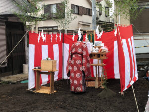 その土地に住む神様を祝い鎮め、 土地を利用させてもらう許可を得ること。