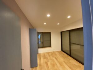 今回は既存がヘーベルハウスの住宅 床をメープルの無垢材 上張り 建具はPanasonic クラフトレーベル それに壁の一面にラベンダーグレーとブルーグレーの珪藻土を塗らせていただき、残りをクロスで仕上げました。