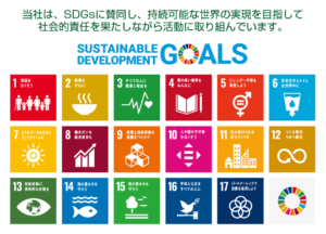 ※SDGsとは、Sustainable Development Goals(持続可能な開発目標)の略で、「誰一 人取り残さない(leave no one behind)」持続可能でよりよい社会の実現を目指す世界共通の目標です。 2015年の国連サミットにおいて全ての加盟国が合意した「持続可能な開発のための2030アジェンダ」の中で掲げられました。2030年を達成年限とし、17のゴールと169のターゲットから構成されています。
