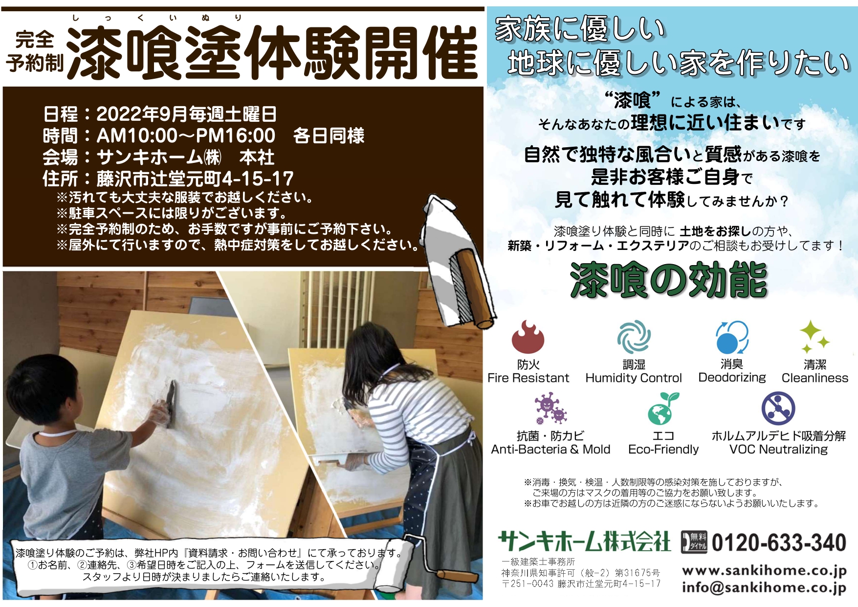 【開催日程】9月の毎週土曜日 【開催時間】AM10:00~PM4:00 【会  場】サンキホーム(株) 本社 【会場住所】藤沢市辻堂元町4-15-17   ※汚れても大丈夫な服装でお越しください。 ※駐車場スペースには限りがございます。 ※完全予約制のため、お手数ですが事前にご予約ください。 ※屋外で行いますので、熱中症対策をしてお越しください。 ※感染予防対策を十分に行い、実施させていただきますが ご来場の方はマスク着用等のご協力をお願いします。     皆様からのご連絡お待ちしています! ※お問合せ先 0120-633-340