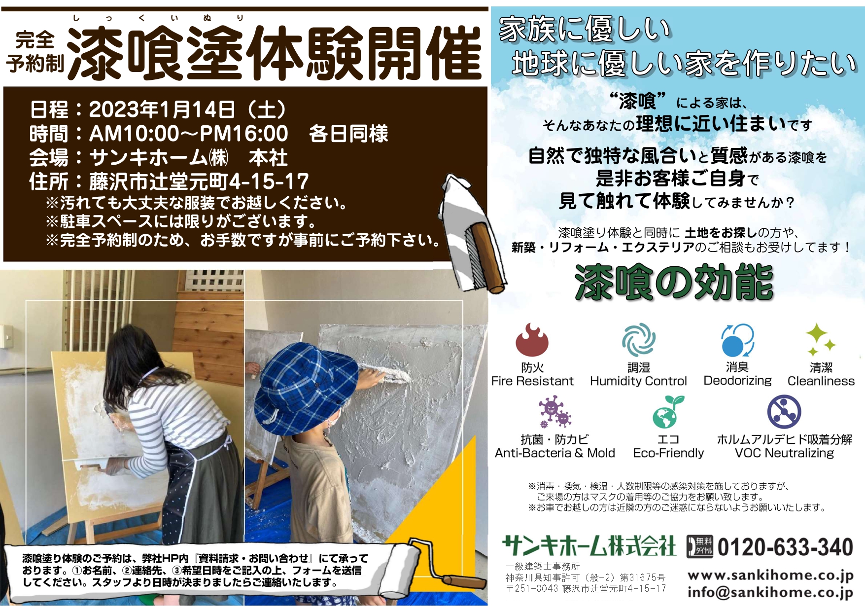【開催日程】1月14日(土) 【開催時間】AM10:00~PM4:00 【会  場】サンキホーム(株) 本社 【会場住所】藤沢市辻堂元町4-15-17   ※汚れても大丈夫な服装でお越しください。 ※駐車場スペースには限りがございます。 ※完全予約制のため、お手数ですが事前にご予約ください。 ※感染予防対策を十分に行い、実施させていただきますが ご来場の方はマスク着用等のご協力をお願いします。     皆様からのご連絡お待ちしています! ※お問合せ先 0120-633-340