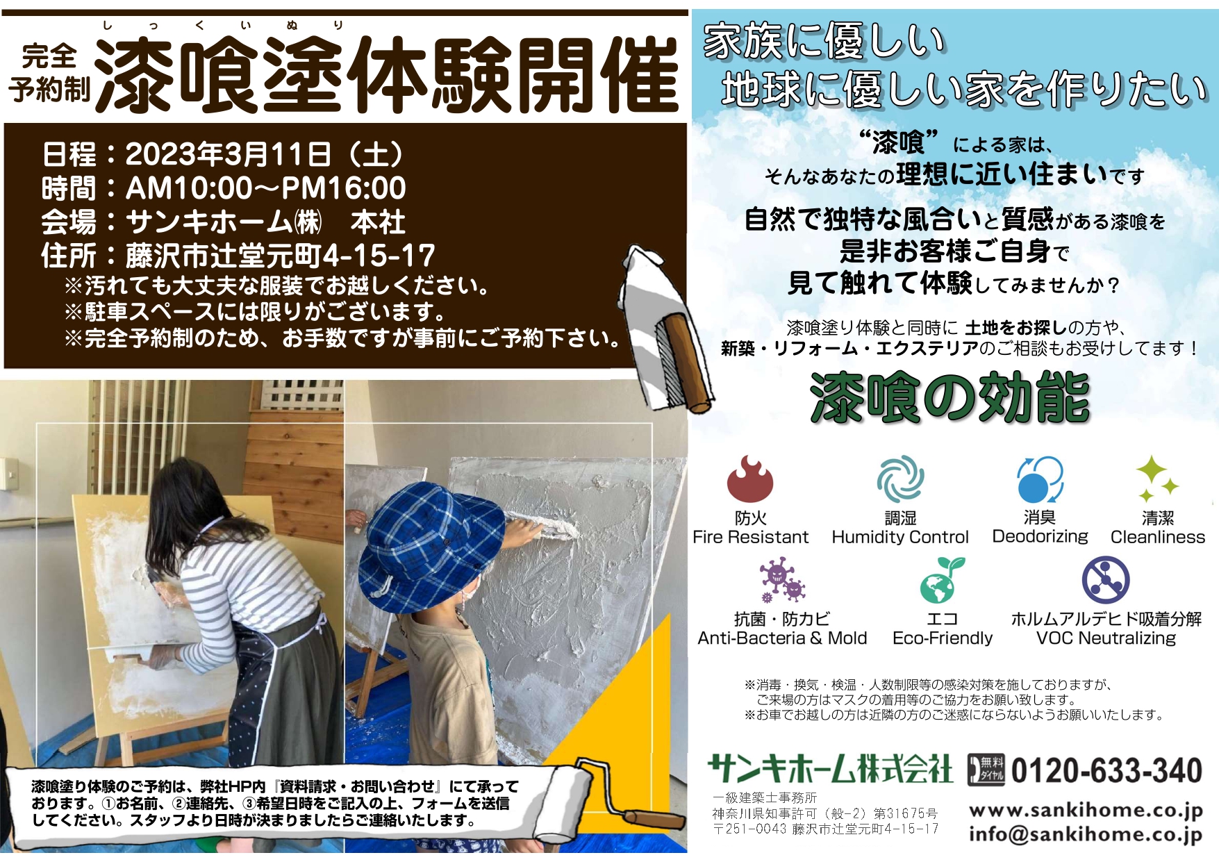 【開催日程】3月11日(土) 【開催時間】AM10:00~PM4:00 【会  場】サンキホーム(株) 本社 【会場住所】藤沢市辻堂元町4-15-17   ※汚れても大丈夫な服装でお越しください。 ※駐車場スペースには限りがございます。 ※完全予約制のため、お手数ですが事前にご予約ください。 ※感染予防対策を十分に行い、実施させていただきますが ご来場の方はマスク着用等のご協力をお願いします。     皆様からのご連絡お待ちしています! ※お問合せ先 0120-633-340